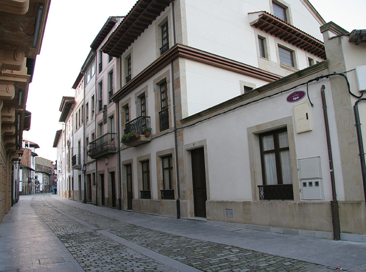 Así lo comenta Plácido Jove Hevia: “En el ángulo formado por la confluencia de las dos únicas calles del pueblo brotaban sendas aguas de una linda fuente; y corriendo las sobrantes por una de aquellas calles suministraban abundante riego a parte de las huertas, por medio de pequeñas presas, que por días alternados colocaban los vecinos, lo cual bautizaba la calle con el nombre de “calle del agua”.